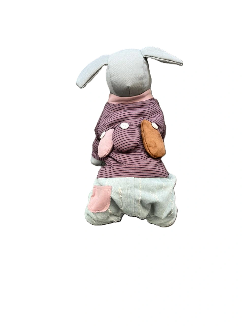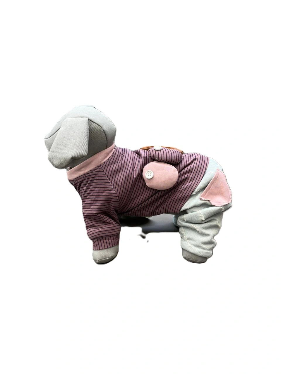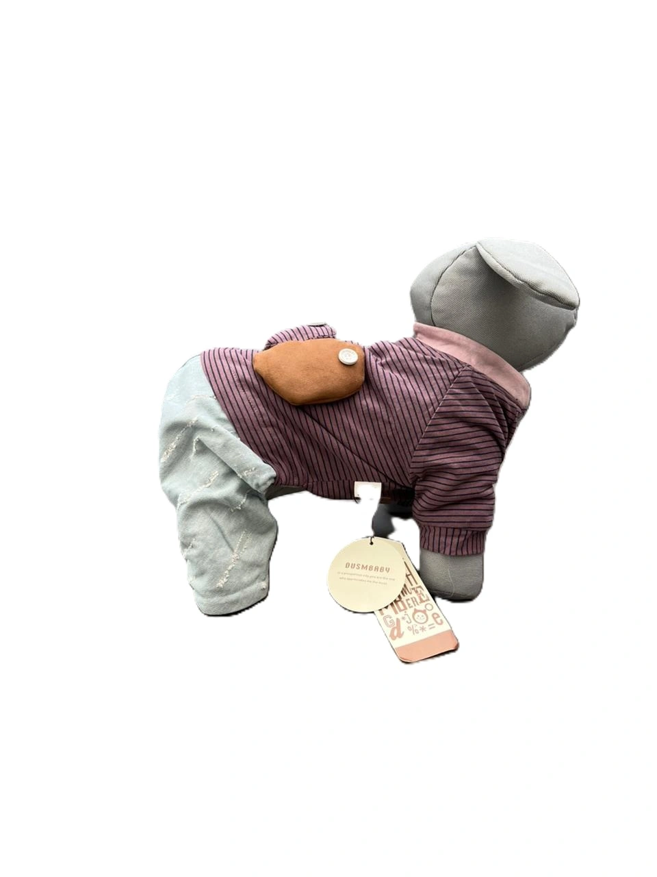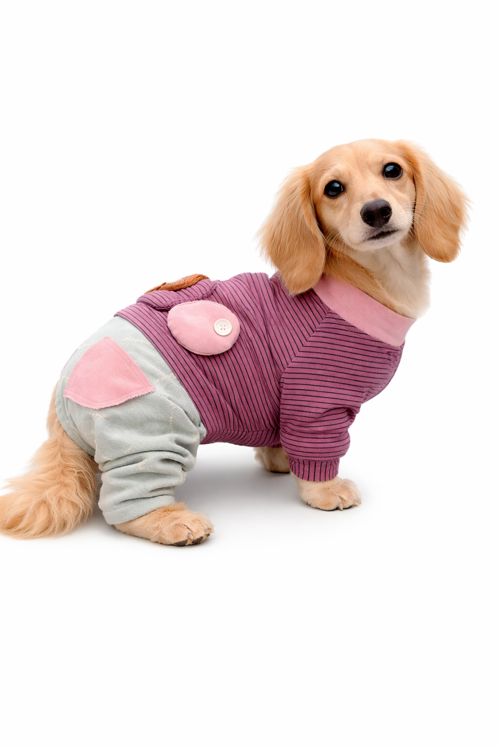 Conjunto perruno cálido de dos piezas con sudadera a rayas en tono vino y pantalón mezclilla en azul tenue con parche rosa y detalle decorativo. Cómodo, suave y lleno de estilo.Medidas: cuello 35 cm, pecho 48 cm, largo 40 cm.
