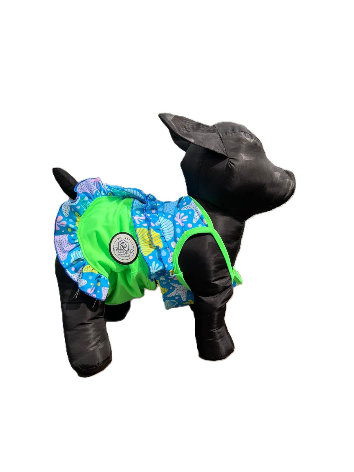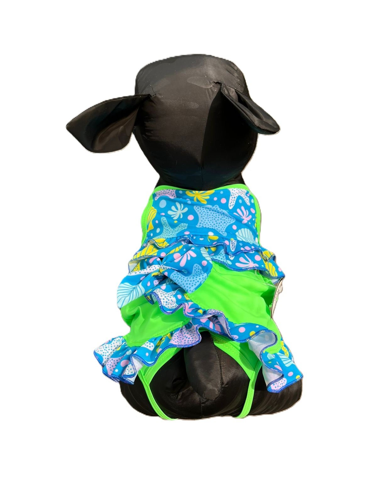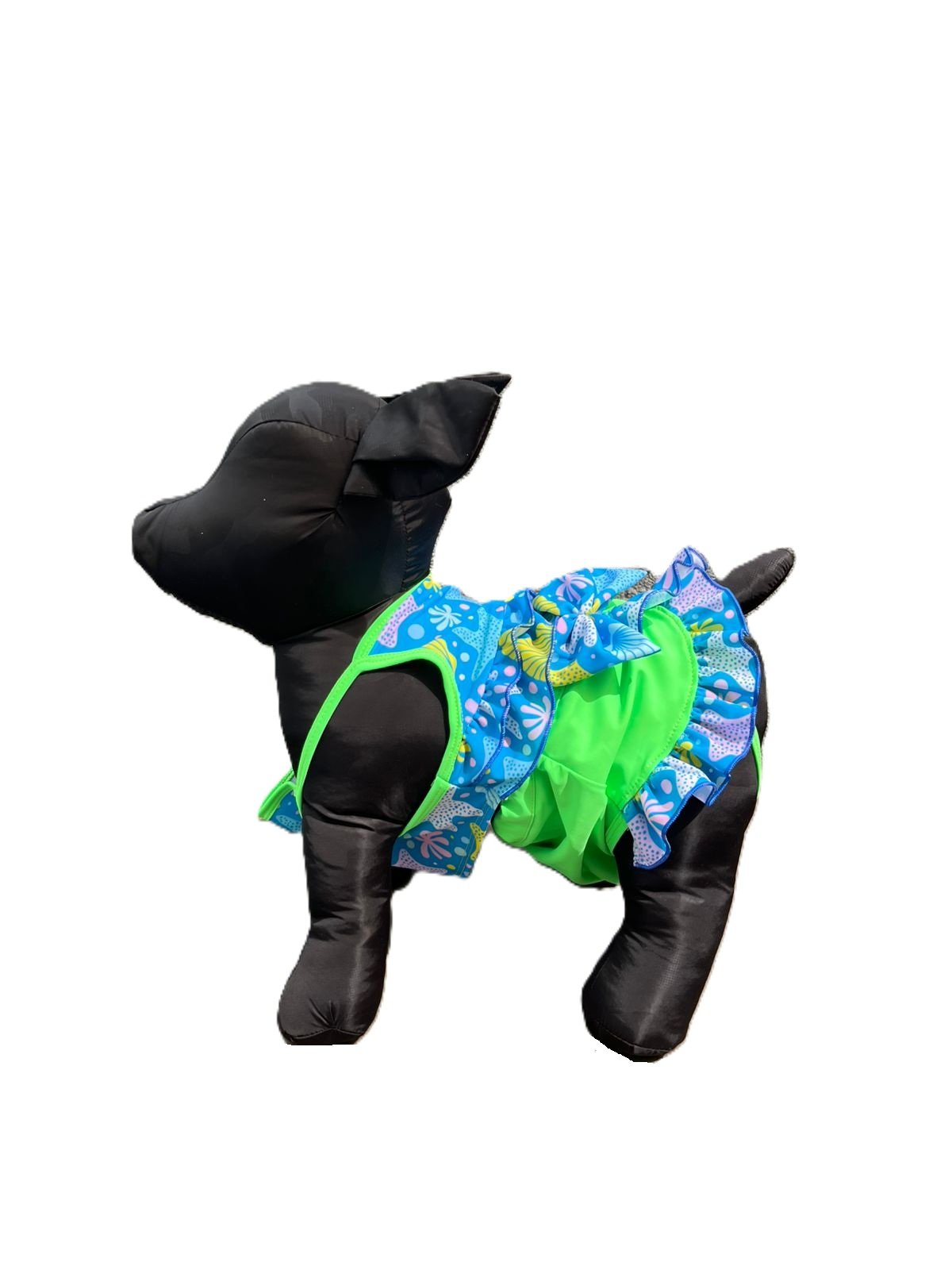 Este traje de baño es ideal para quienes buscan una prenda que combine comodidad, estilo y un diseño único, permitiendo que su mascota disfrute del verano con un look adorable y moderno.