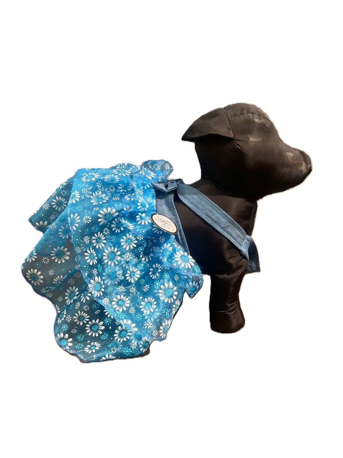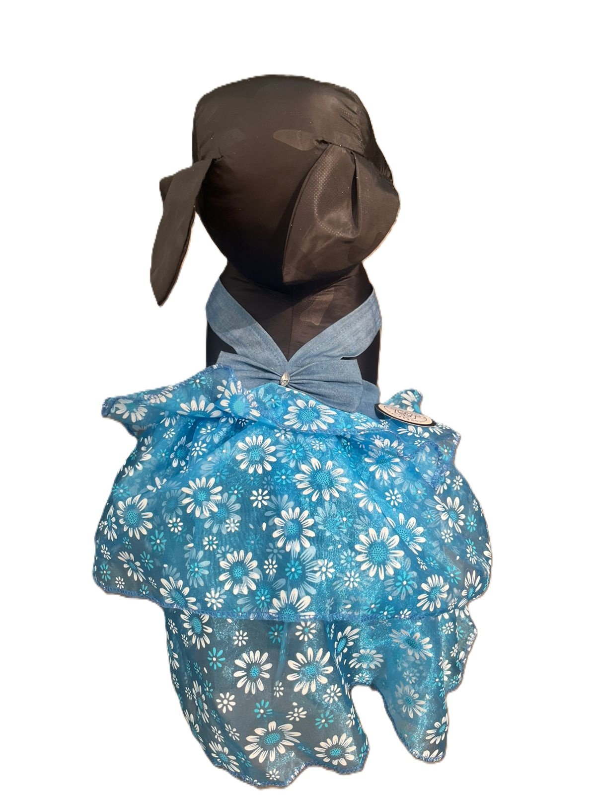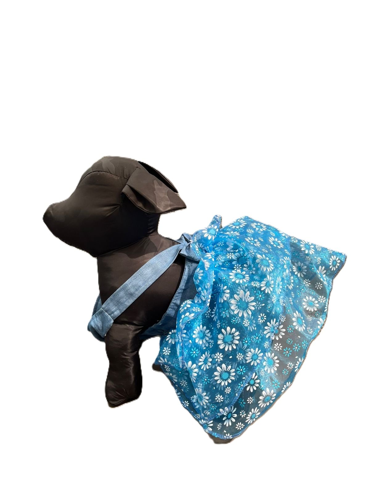 La parte inferior está elaborada en tul ligero con estampado floral azul turquesa con margaritas, creando un efecto vaporoso y femenino que realza la apariencia de tu mascota. Su diseño permite libertad de movimiento, ideal para paseos, eventos especiales o sesiones de fotos.