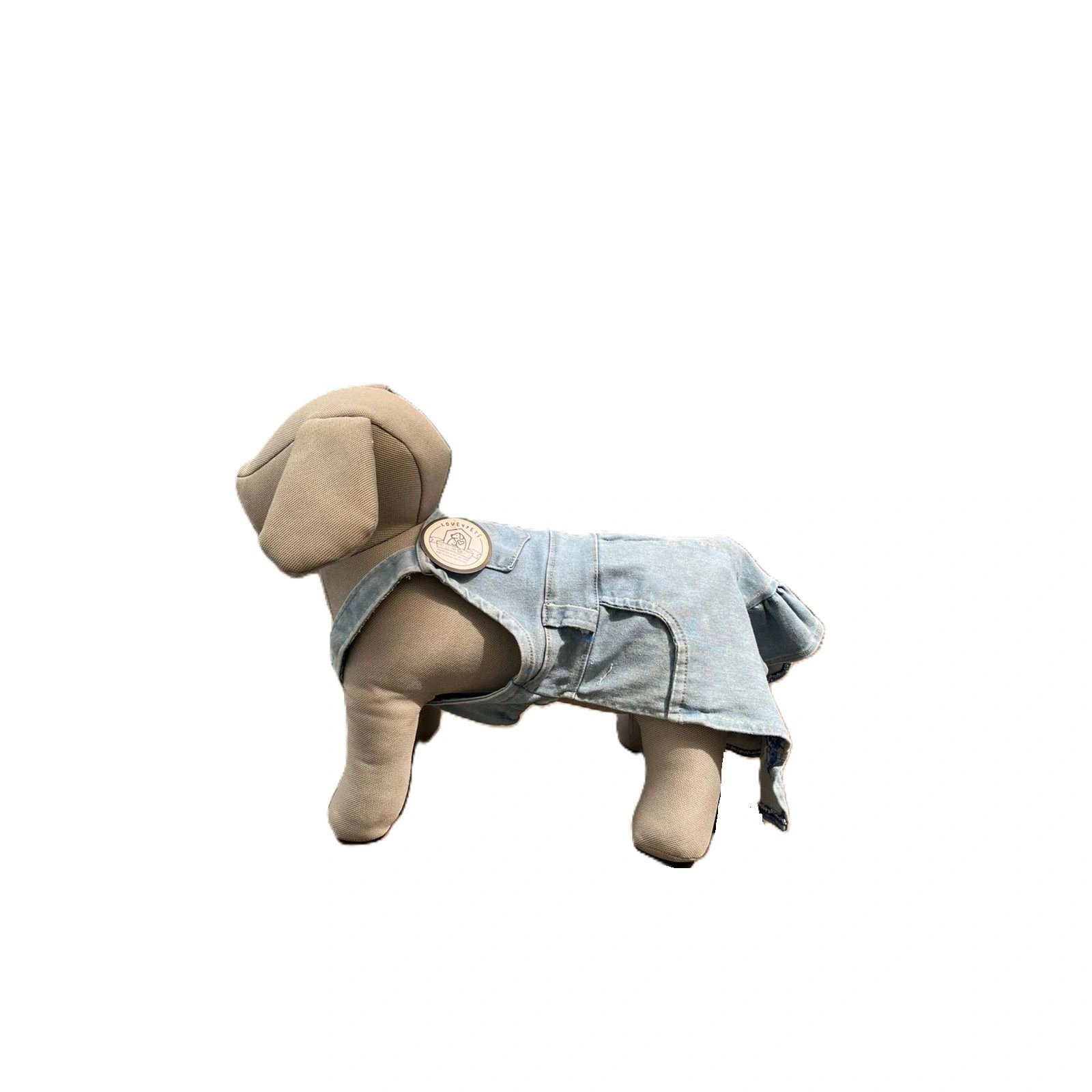 El vestido está confeccionado en tela de mezclilla (denim) en color baby blue suave y resistente, lo que proporciona durabilidad y comodidad al mismo tiempo. Su textura ligera permite que tu mascota se mueva libremente mientras disfruta de sus actividades diarias.